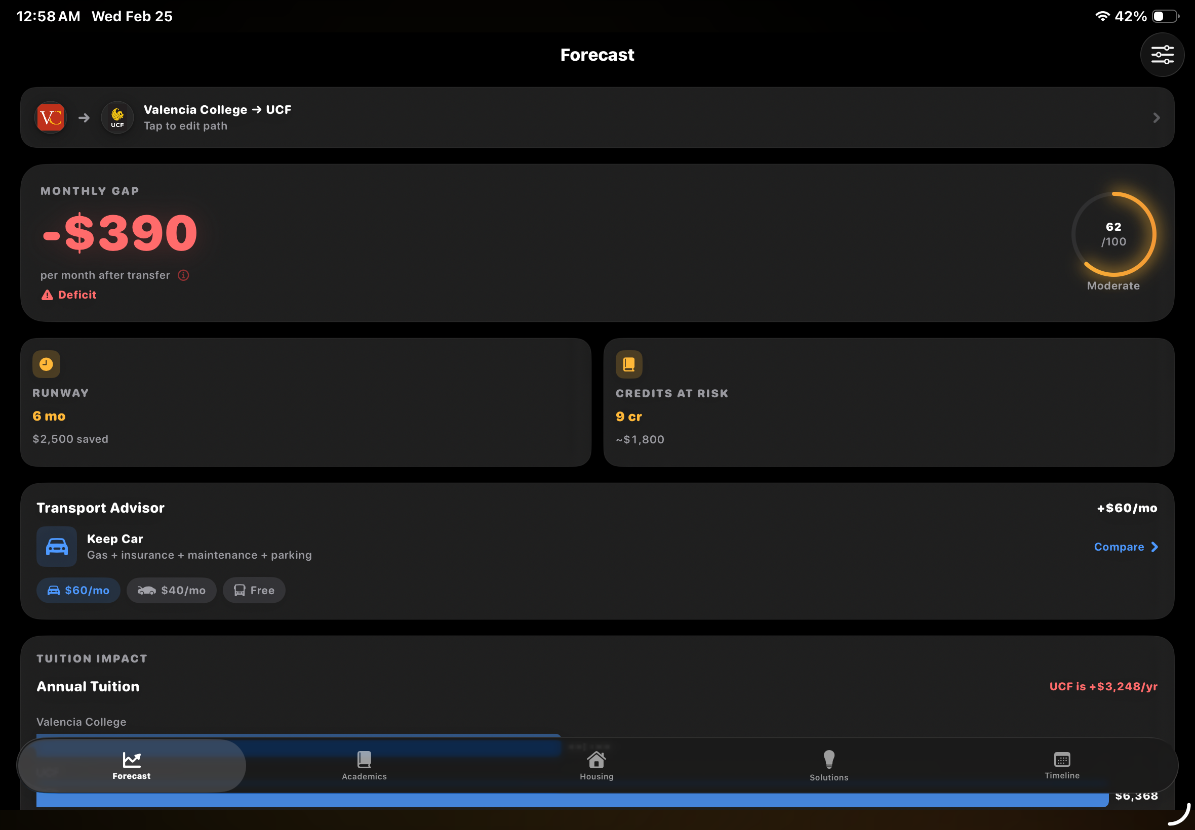 TransferTrack is the tool i wish someone had handed me on day one. it's a fully offline iOS app that forecasts your exact monthly deficit after transferring, scores your transfer viability with CoreML, scans physical transcripts with VisionKit, and gives you step-by-step solutions with real dollar amounts. 7 states, 31 community colleges, 34 universities. no internet required.